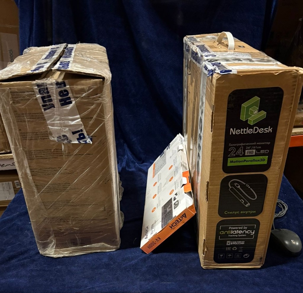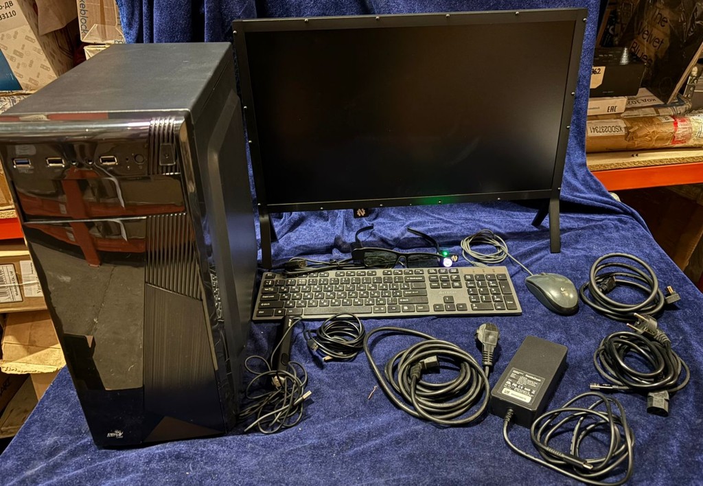 Упаковка вскрывалась. Оборудование использовалось. Есть мелкие царапины на системном блоке и мониторе. В Комплект входит: системный блок, монитор, клавиатура, мышь, 2 кабеля питания, стилус, 3д очки, 2 кабеля type c.