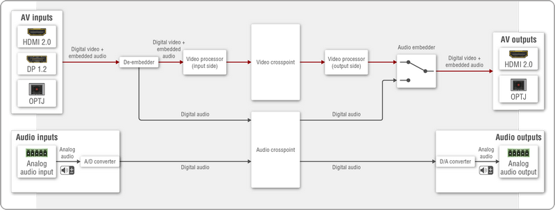 Помимо шести видео плат с 4 портами ввода и шести видеоплат с 4 портами вывода, есть четыре низкоскоростных устанавливаемых слота для плат аудиовхода и вывода Dante, ADC и DAC, GPIO, USB и других вариантов подключения.