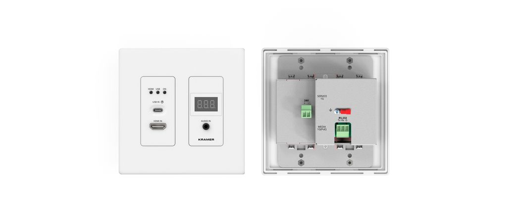 WP-SW2-EN7 — кодер и передатчик в сеть Ethernet сигналов HDMI разрешением до 4K@60 Гц (4:2:0), USB, аудио и RS-232. WP-SW2-EN7 производит автоматический или ручной выбор входа USB-C или HDMI, преобразование видеосигнала с выбранного входа, а также сигналов эмбедированного аудио и RS-232 в цифровой поток, передаваемый по IP-сети 1G на основе медной витой пары в режиме Unicast или Multicast. Прибор выполнен в виде двухместной встраиваемой настенной панели в американском или европейском исполнении белого цвета (имеются рамки и лицевые панели чёрного цвета в качестве дополнительной опции).