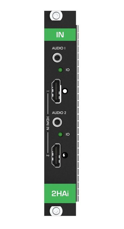 MC3-2HAi — двухканальный входной модуль HDMI c поддержкой HDR и разрешений до 4K@60 Гц (4:4:4) и портом небалансного аналогового стерео аудио, предназначенный для использования в составе шасси мультиформатного модульного матричного коммутатора MTX3-34-M. Модуль осуществляет ввод двух сигналов HDMI в модульное шасси, а также производит (при необходимости) эмбедирование/деэмбедирование аналогового небалансного стерео аудио в/из HDMI, а также вывод обратного аудиоканал (ARC) — по выбору, с использованием одного и того же аудиопорта в каждом из двух каналов.