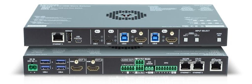 UCX-4x2-HC30D - универсальный коммутатор Lightware, который использует подключение USB-C для упрощенной передачи видео 4K, аудио, сигналов управления и питания, предоставляя участникам встречи простое переключение между хостами, а также комплексные и безопасные функции Ethernet в сочетании с возможностями звука Dante / AES67.