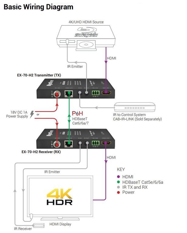Комплект приемника и передатчика, работающих по технологии HDBaseT. Поддержка 4K HDR, HDMI 2.0 и HDCP2.2. Позволяют передавать HD видео, аудио, двунаправленные RS-232 и ИК, а так же питание на расстояние до 70 метров для 4K и до 100 метров для 1080p.